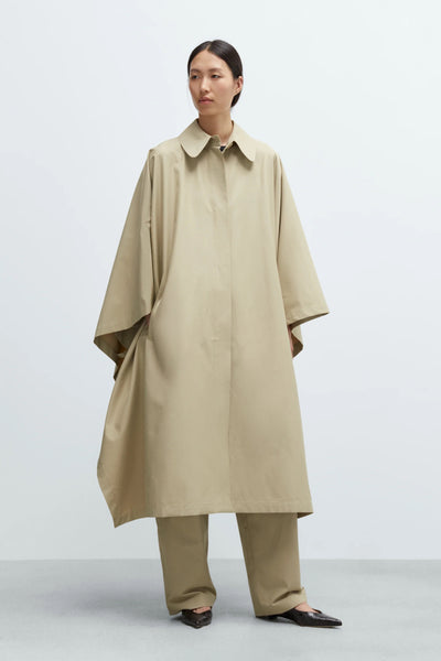 Combining the classic elements of the trench coat and cape detailed with a spread collar and button closure running all the way down, with only the top button visible. Featuring front pockets and a flowing cape shape, secured with side buttons for a clean silhouette. Oversized and maxi-length. Water repellent. Perfect for layering over any look.