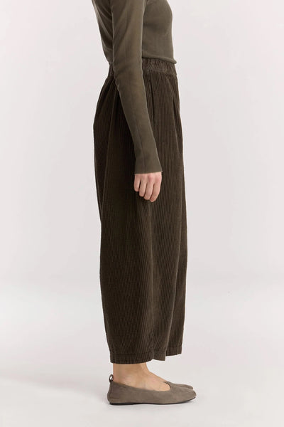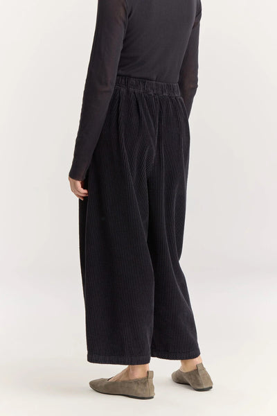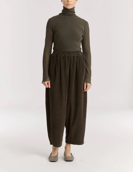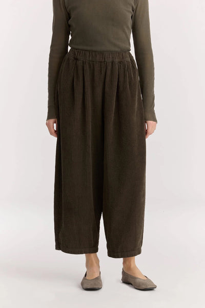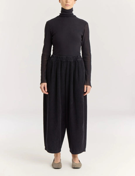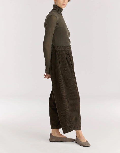 Wide-leg pant in soft cotton corduroy, featuring elasticized waistband, creased box pleat details at the front and back, slight drop crotch and side seam pockets. Oversized fit. Please note that there are slight variations in colour due to the special garment dye.