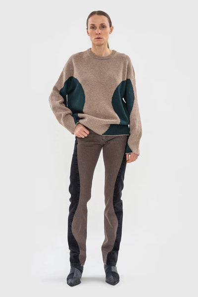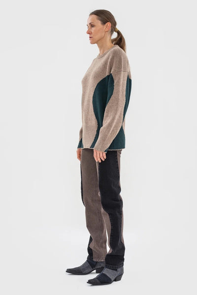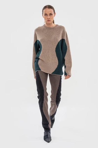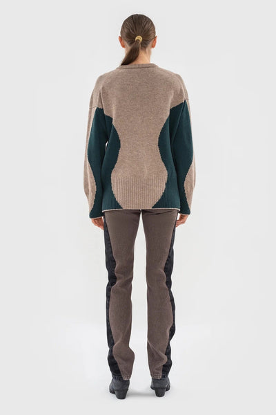 Beautiful sweater in wool-blend, with Beige coloured front and Dark Green wavy side panels. Relaxed fit, which tapers in slightly at the waist. Featured here with the Wavy Jean with Contrast Sidelines in Washed Chestnut x Black.