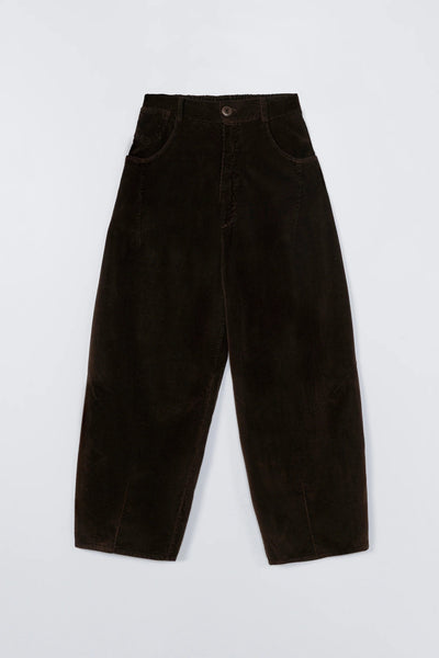 Wide leg pant in beautiful soft corduroy, in a deep chocolate brown. Detailed with elasticized waistband, side pockets, and single back pocket. Baggy design and loose fit.
