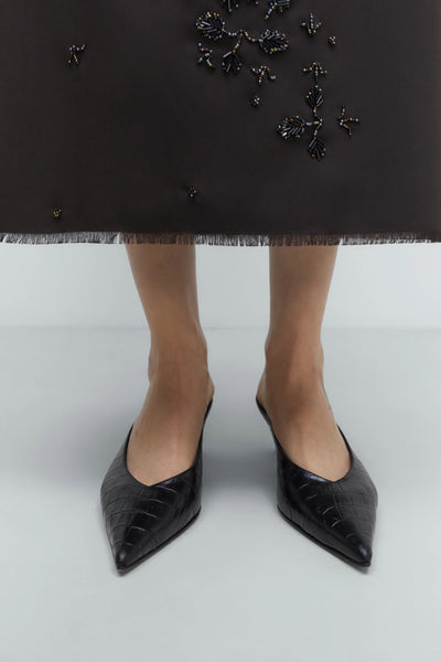 Gorgeous pointed mule with a 6 cm curved heel, gently angled inward. Made from high-quality calfskin in a crocodile black print for a sleek, sophisticated look. Perfect for adding a touch of elegance to any outfit.