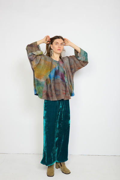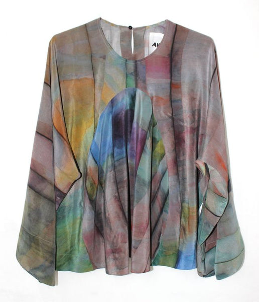 Long-sleeved top in dreamy watercolour-print silk, reminiscent of stained glass.  Featuring rounded neckline, wide sleeves, keyhole button closure at the back of the neck, and arched panel with beautiful draping effect at the front. Slightly cropped fit. One size.